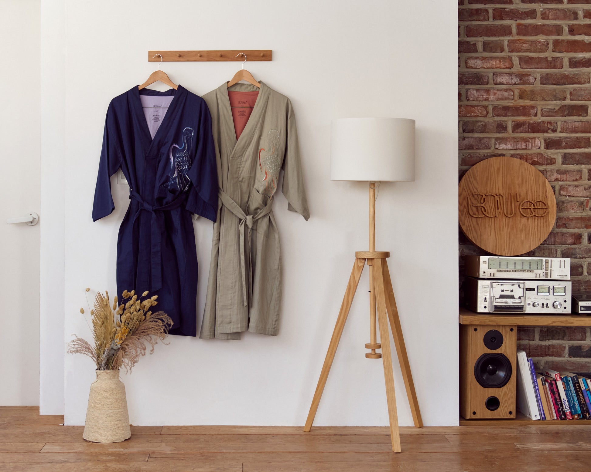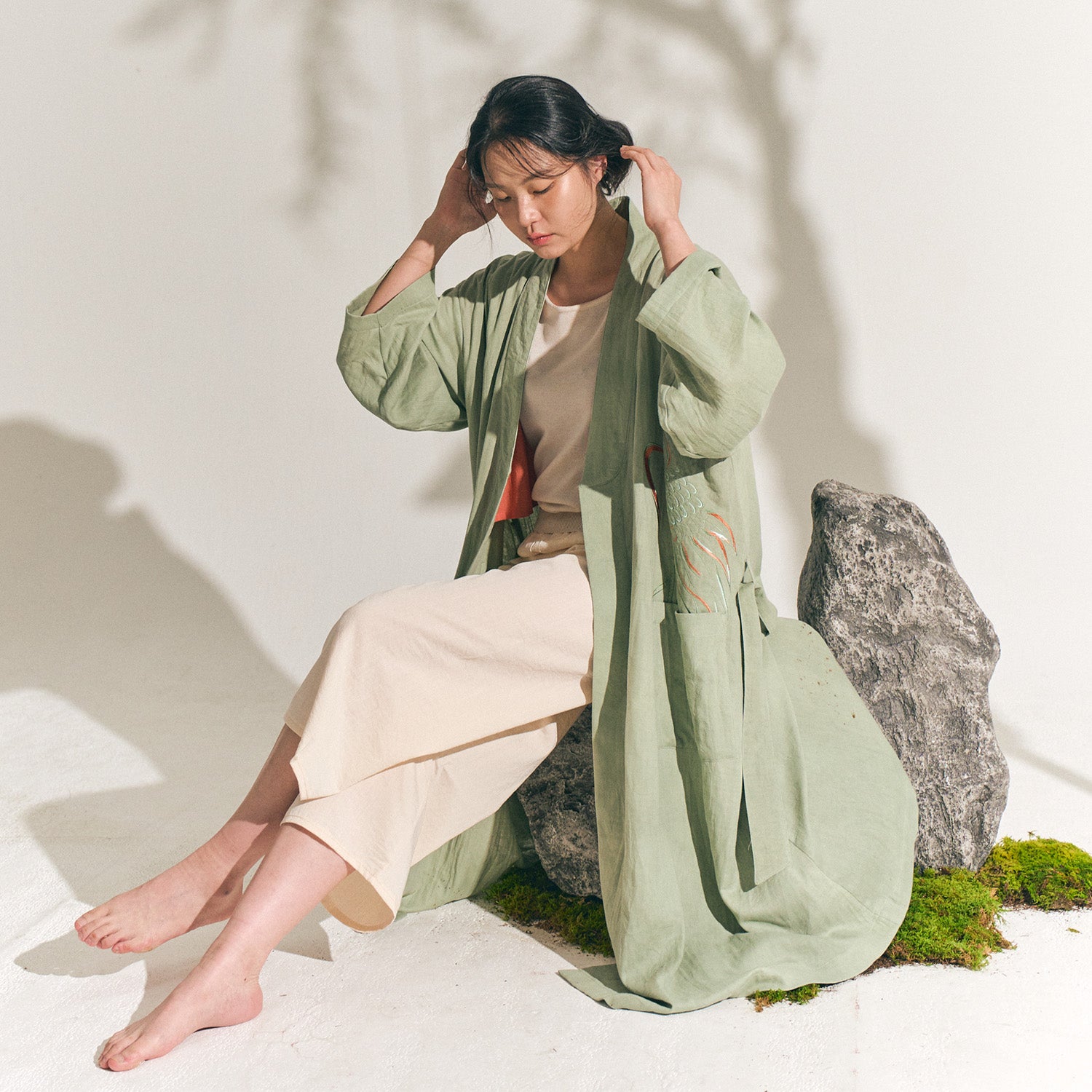 Inspired by the 'Durumagi', a traditional Korean overcoat worn over the Hanbok, the robe is a modern reinterpretation of Korea's traditional aesthetic. The representative folk paintings of the Joseon Dynasty, Crane and Peony, symbolizing longevity, wealth, and prosperity, were drawn in free lines and expressed with luxurious embroidery, connecting you to the rich cultural heritage of Korea. The line from the 'Git' to the front 'Seop' beautifully fuses traditional design with modern aesthetics, while the sleeves use a gentle 'Bungeobaerae' line, adding an intriguing twist to the traditional design.