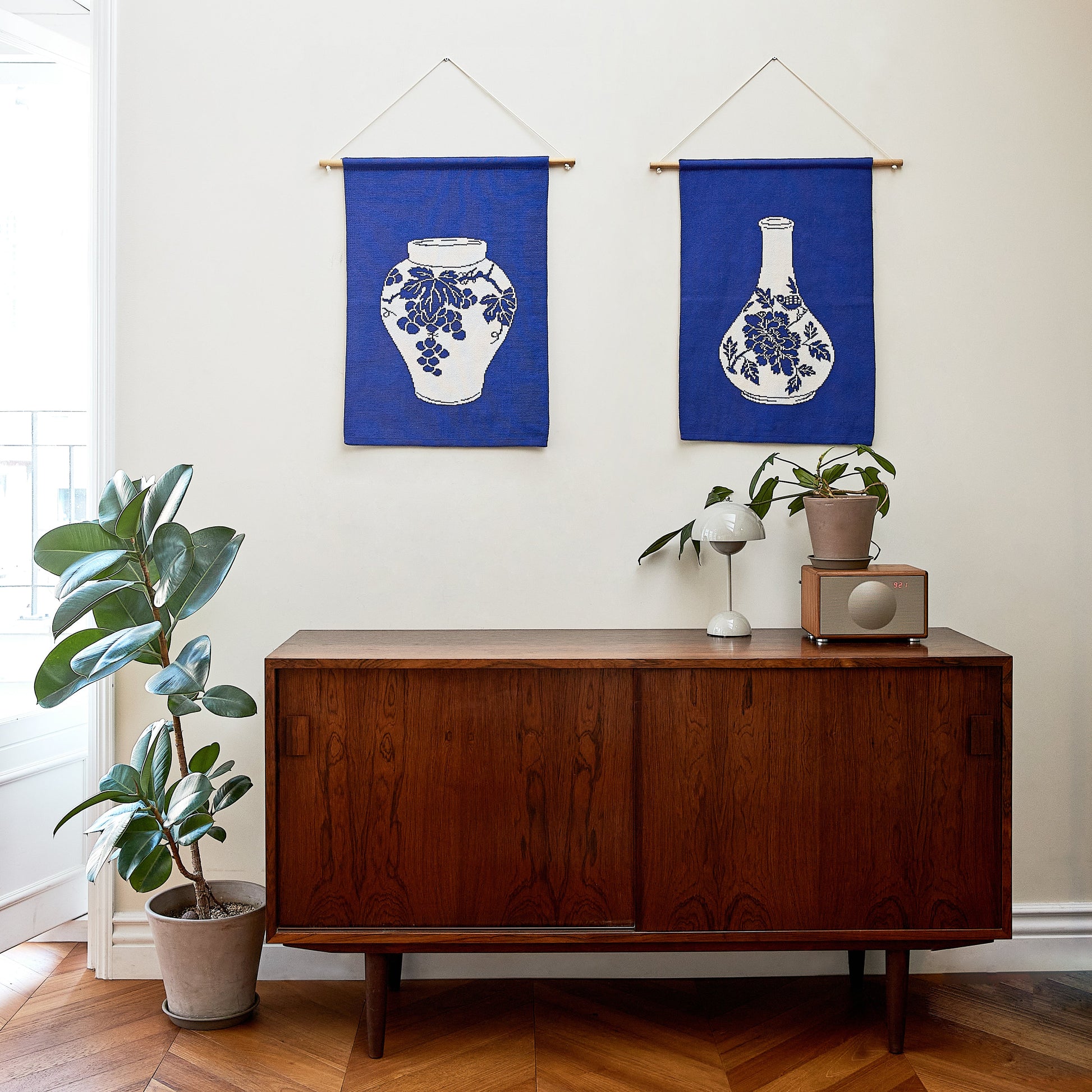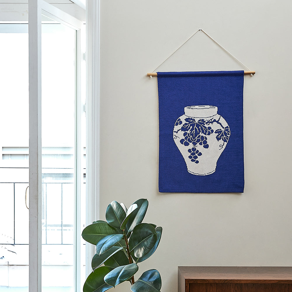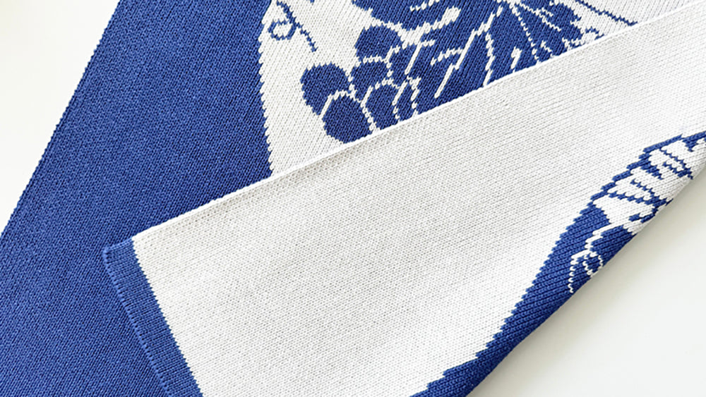 In Minhwa (Korean folk art), small fruits symbolize good luck and wealth, while grapes represent fecundity and abundance. This unique mini artwork, with its minimal color palette, exudes sophistication. Its unique reversible design, created through double-sided Tubular Jacquard knitting, features different colored patterns on each side, allowing for versatile display options. Use as wall art, a table mat, or even as a small blanket!