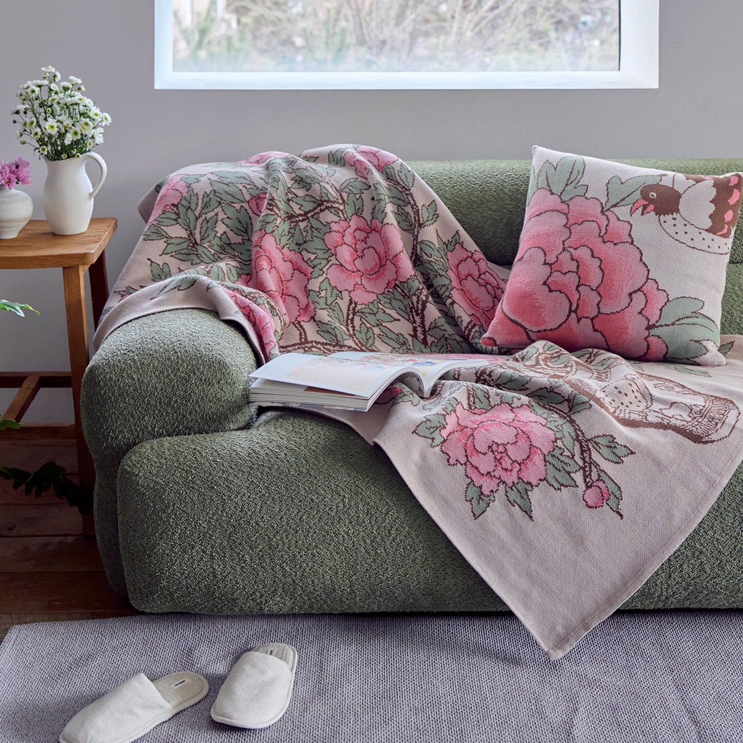 Peonies are the most magnificent of all flowers, symbolizing wealth and prosperity since ancient times. Peonies in a vase signify the delivery of wealth and happiness. The peony branches that stretch boldly from the vase and their splendid blossoms represent intense vitality. The pair of affectionate birds drawn on the vase embodies a wish for a life filled with love, wealth, and prosperity. Complete your decor with our matching Peony Cushion Cover Set.